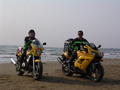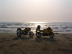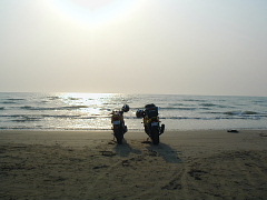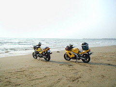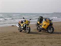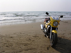 バイクに乗って波打ち際まで(^0^v 感動!気持ちイイ〜!!