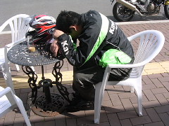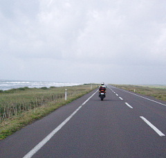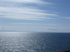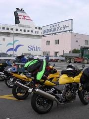 | *海上* お天気Goodです!フェリー乗り場にはバイクがいっぱいいます。乗船待ちの時に声を掛けられました「こんにちは、 あのー、雑誌に載りませんでしたか?」「バイクとジャケットでわかりました」と・・・うっへ〜オハズカシイ (* ̄Θ ̄*) もう悪いことは出来なくなったと悟った瞬間でした(爆) そんなこんなで無事出港、船の旅を満喫?できたのかなぁ。。。まぁ、ほとんど寝てました。(^0^; |