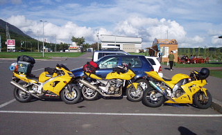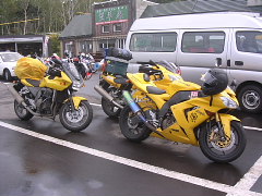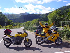 | 朝、ブンブンハウスの前で記念撮影をした時に、9Rが倒れました。こともあろうに私のゼッツ君の右側にね! しかしゼッツ君は踏ん張りました〜。将棋倒しになったら目も当てられない(><; 頑張ったよ、エライ★ みんなが起こしてくれて事なきを得ました(^−^; ゼッツ君も目立った怪我もなかったんだけど・・・ タマちゃんはキズがぁ〜 ドンマイ( -_-)ノ☆(*_ _)パシ みんなに挨拶をして出発しました♪ 今日も良い天気だぁ! 上川町のラーメンを朝食にと決めて行ってみたんだけど、朝早すぎてどのお店もやってませんでした(T^T)クウゥ 先に進むべく層雲峡に向かって走っていると、木々の間から山頂が見え始めました。山頂は雪で白くなっていました! 夕べは暖房点けるほど寒かったもんなぁ。。。。そうです、大雪山の初冠雪なのだ!キレイだぁ〜