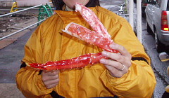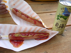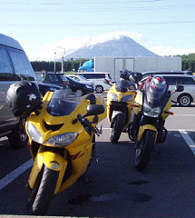 | 朝起きたときは曇り、昨日はよーく降ったもんなぁ。もういいよね?なーんて話しながら出発の準備! 今日は、YellowsのBT@017さんと合流し美味しい道と美味しい食べ物を紹介してもらうのだ〜(笑) 待ち合わせは小樽駅!海産物のお土産を買うためわざわざ行くのです(^^; 走り出してまもなくポツポツときて大通り抜けてR5に入った辺から本降りに、そして土砂降りに・・・ おいおい、今日はダメなのかぁ????最後の日だって言うのに。 こんな雨だったらまっすぐ苫小牧東に向かうしかないんだろうなぁと淋しい心持ちでした。 雨と渋滞で予定よりも遅れて到着。駅前にBTさんを発見!というかバイクを先に発見したんですけどね!?(笑) 久しぶりの再会に挨拶を交わし、路肩駐車なので早速走り出す。まずは、海産物屋さんへGo★ BTさんの紹介のお店で、味見にと渡されたカニの足!!! 一番上が身の部分です!?デカかったです(笑)そして、美味しかったのは言うまでもないですね(^−^v この後、ホタテやいくらやをすごい量食べて、味見なのにお腹いっぱいになってしまいました(爆) 自宅への発送手続きをしました(←帰宅後、バイク便で親兄弟に配布しました〜ちなみに姉です) 黄色いバイク3台に合羽の黄色を着込んだ私たち2人で目立つ、目立つ、お店の人もワイワイと集まってきて おしゃべりしました そうこうしてる間に雨がパラつき程度になりました。これからは『晴れるよ』の言葉を信じて次へ向かいました。 定山渓レークラインでは、私の大好きなループを走りました。路面が濡れているのが残念だったなぁ。 道はとーっても気持ちの良かったです!それとちょっと車が多くて自分のペースでなかったのが残念! 温泉郷内にある足湯に浸かりました〜♪ これから先はもう雨は止んでしまい、あとは路面が乾くのを待つのみ!\(^○^)/ヤッター 太陽の陽射しを感じつつ、快走〜 ε=ε=ε=ε=ε=ε=┌(≧∇≦)┘フハハハッ