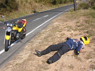 しばし休んで出発したのですが、 のんのん♂さんはワインディングのあと 後続を待つ間倒れこんでいました(^-^; ※ここまでで走行距離約600kmです※ ← 愛車BALIUSUが優しく見守ってます♪ |